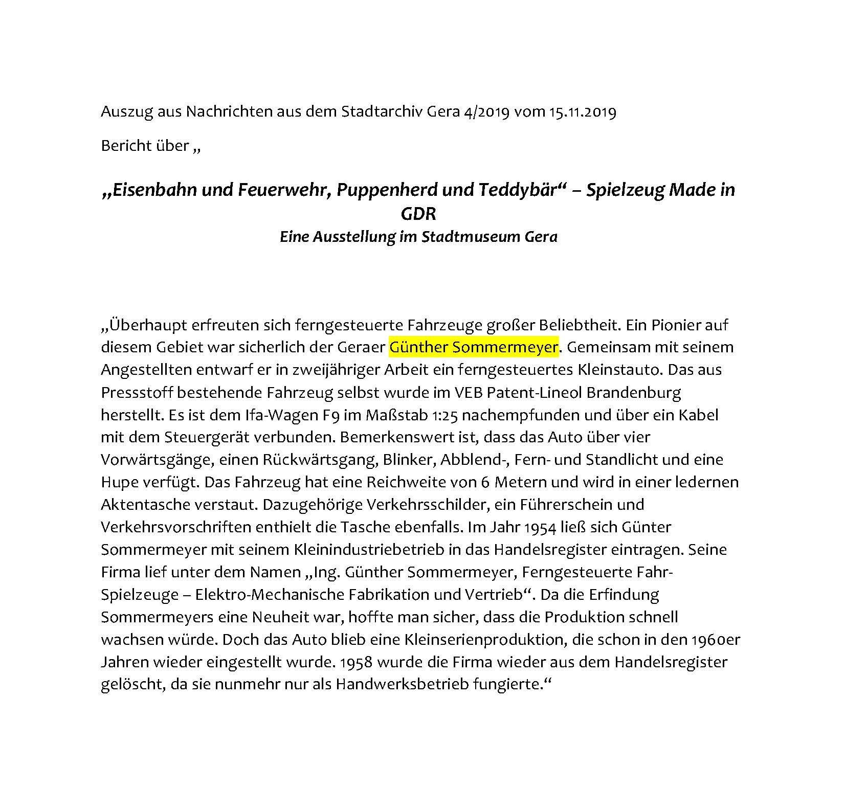 2019 wurde eine Sonderausstellung im Stadtmuseum über DDR-Spielzeug kreiert, die auch das Auto präsentierte. Der dazugehörige Zeitungsartikel in der Ostthüringer Zeitung vom 30.09.2019 der Museumspädagogin Tabea Pandorf (textgleicher Artikel auch in den Nachrichten des Stadtarchives) ist in sofern zu korrigieren, dass die staatlichen Repessalien unerwähnt bleiben. Auch die Aussage hinsichtlich der „Kleinserie“ kann durch den Artikel von 1954 vom November in der Volkswacht nicht bestätigt werden. Leider wurde in Vorbereitung dieser Sonderausstellung im Stadtmuseum nicht der Kontakt zu uns gesucht. Die Rechersche ist mangelhaft und oberflächlich, eigentlich schade.