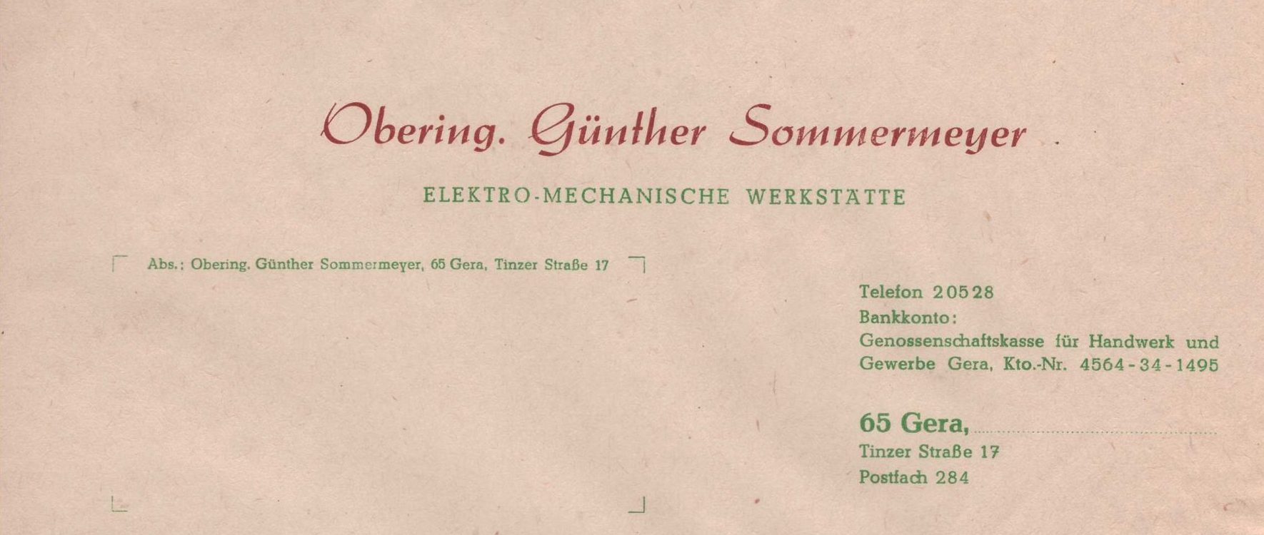 Seine Werkstatt befand sich in der Gereaer Leibnitzstr. 11. Im Vorderhaus Parterre das kleine Büro und im Hof im Seitengebäude die Werkstatt.