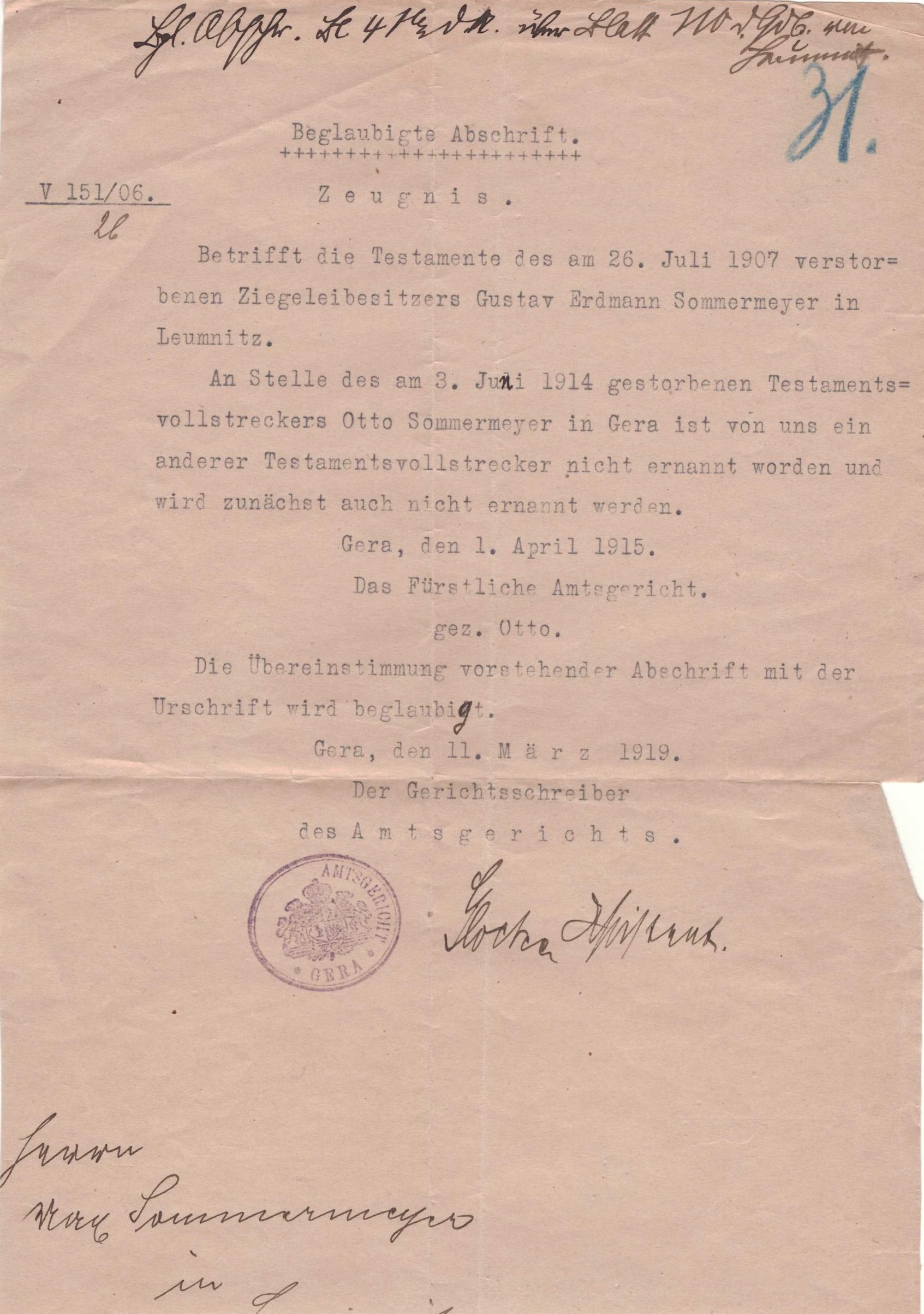 Am 26. Juli stirbt Gustav Erdmann Sommermeyer in Leumnitz im 56. Lebensjahr. Es ist die erste Erschütterung, die die nicht mehr ganz junge Firma bewältigen muss.