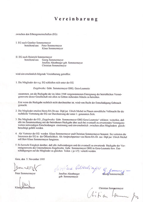 1995 schlossen die 5 Enkel von Max eine Vereinbarung zur Betreibung der Rückgabe der enteigneten Ziegelei nach Heinrichs Tod 1992.