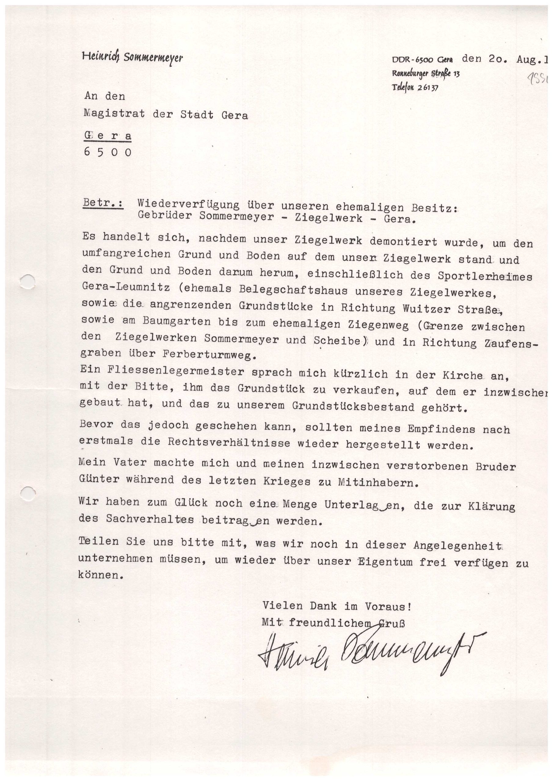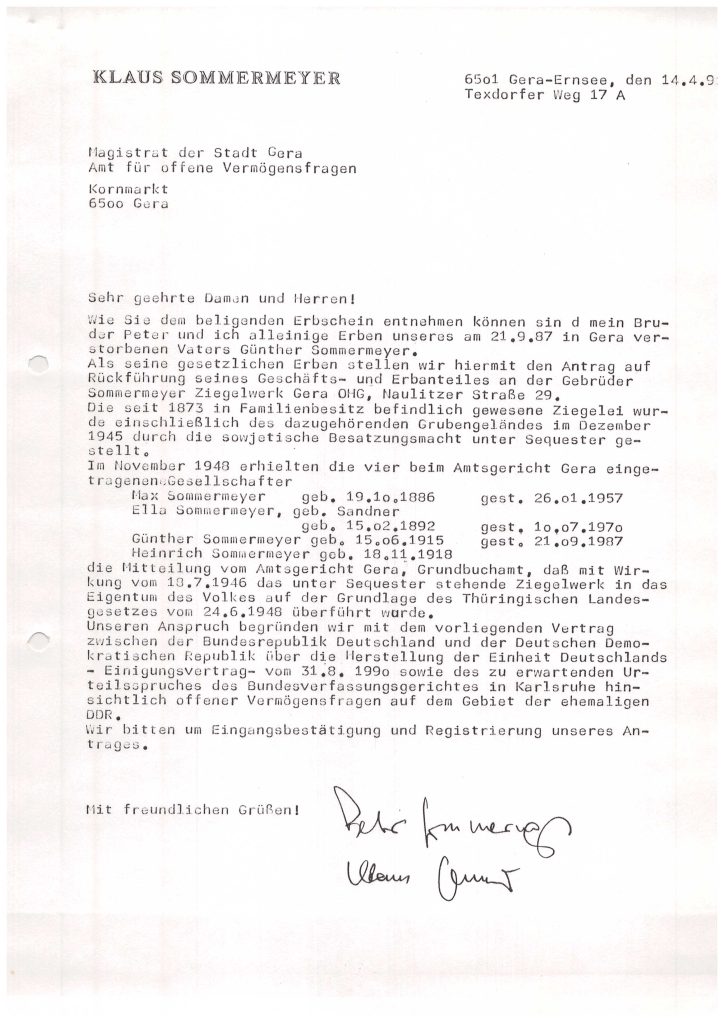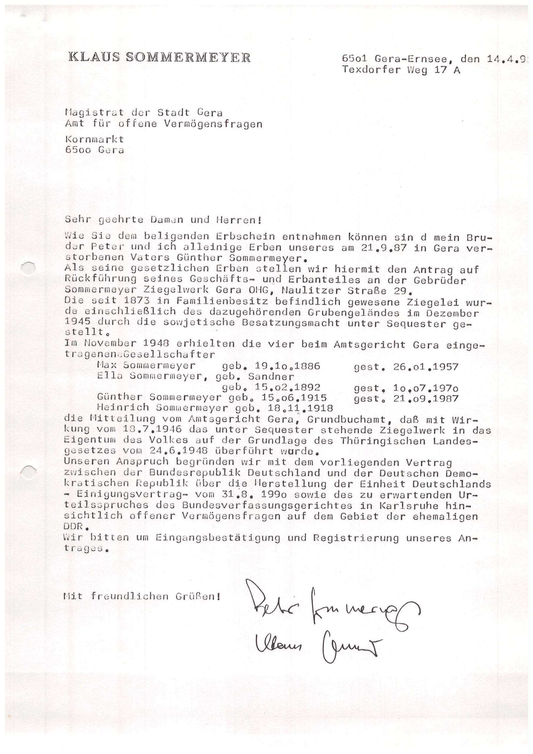 Mit Schreiben vom 20.08.1990 stellte Heinrich, später dann mit Datum vom 14.04.1991 auch Peter und Klaus den Antrag auf Rückgabe der 1945/48 enteigneten Fa. Gebrüder Sommermeyer Ziegelwerk Gera beim inzwischen eingerichteten Amt zur Regelung offener Vermögensfragen.