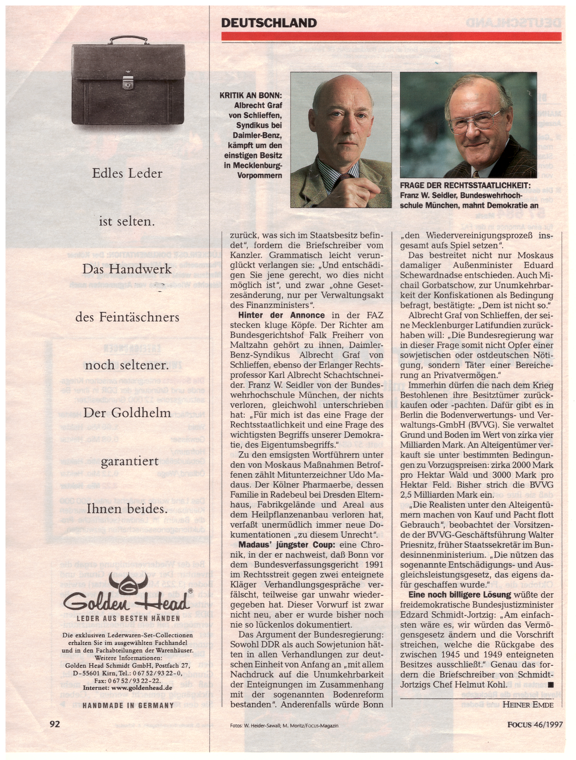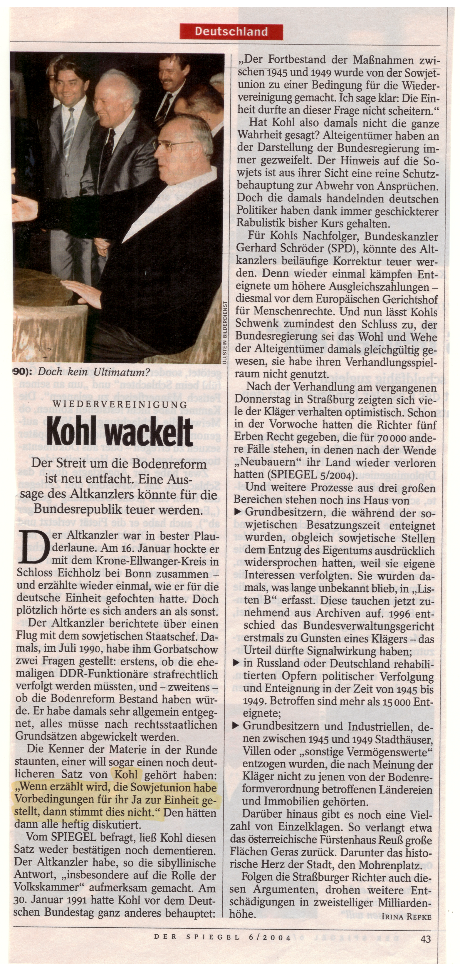 Dann war lange Zeit Ruhe im ganzen Verfahren. Auch die neue Regierung unter Kanzler Schröder, die 1998 an die Macht kam, hatte kein Interesse, die Verfahren gemäß des „Gesetzes über staatliche Ausgleichsleistungen für Enteignungen auf besatzungsrechtlicher oder besatzungshoheitlicher Grundlage, die nicht mehr rückgängig gemacht werden können (Ausgleichsleistungsgesetz – AusglLeistG)“, das am 1.12.1994 in Kraft trat, zu beschleunigen.