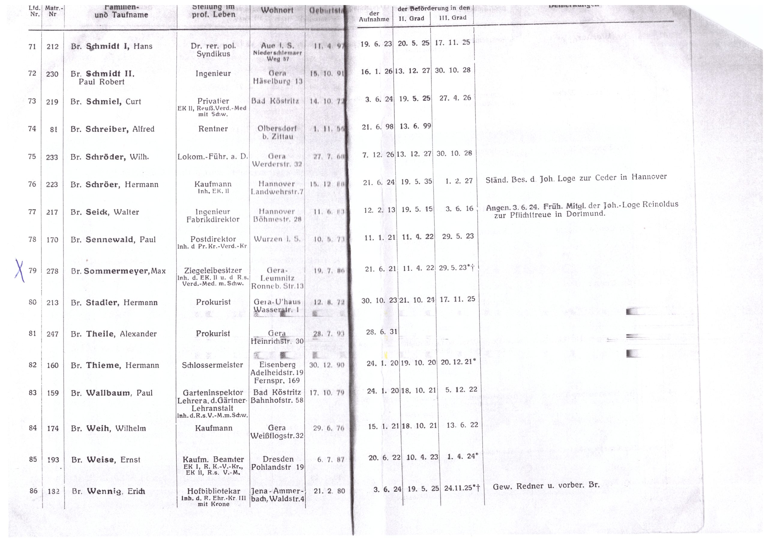 Max war seit Juni 1921 Mitglied der Johannes Loge „Heinrich zur Treu“. Wenige Monate später war er bereits Mitglied der „Andreas Loge“ und der „Kapitelloge“ (siehe Ausdruck „der Beförderung in den II. und III. Grad“). Er hat also auch dort schnell Karriere gemacht. Vor dem Kriminalamt in Gera Anfang 1948 sagte er aus, dass er 7 Jahre Freimaurer war. Das würde bedeuten, dass er 1928 „bereits“ wieder ausschied!! ??