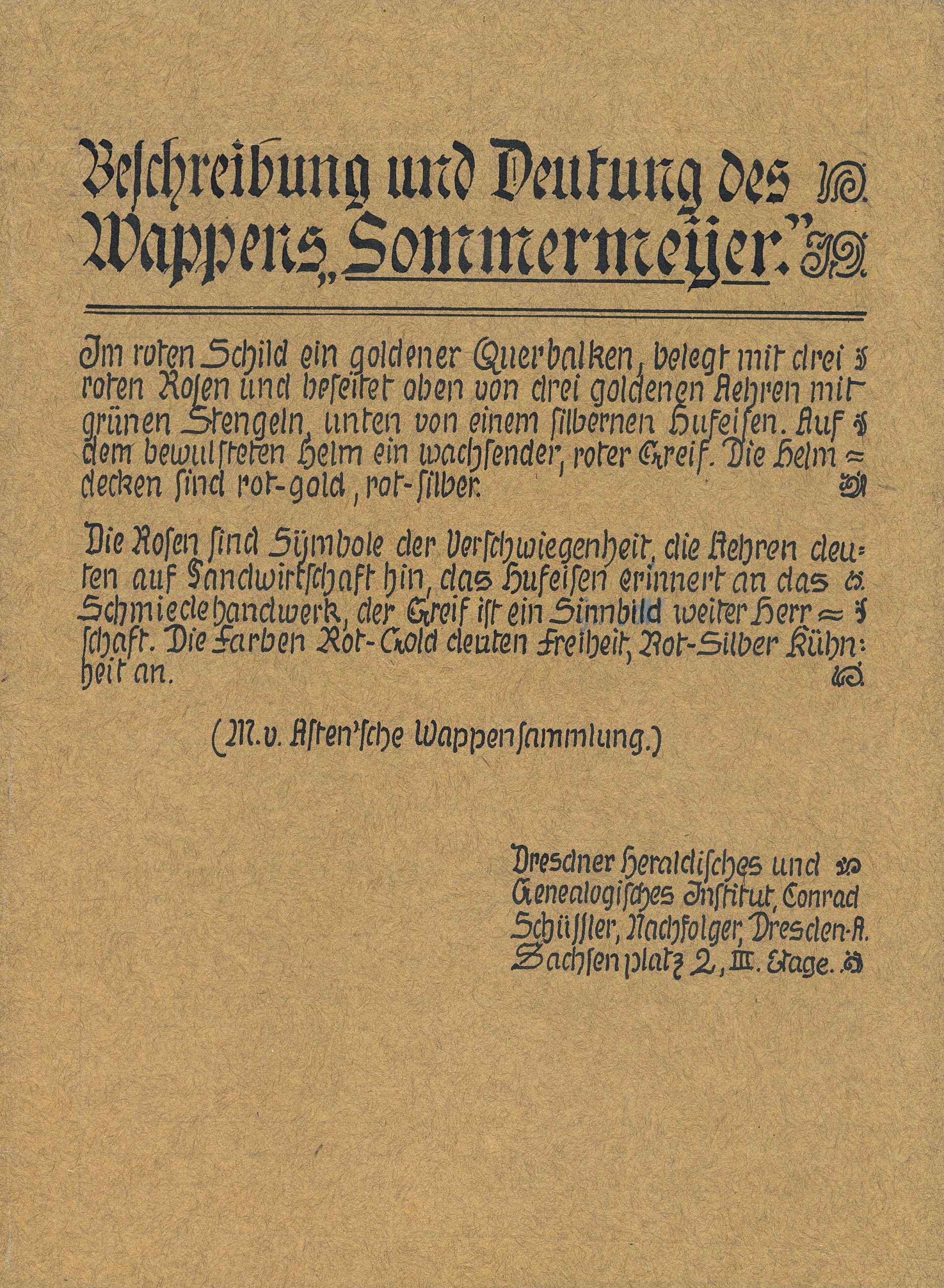 Die heraldische Erklärung der Wappen Symbolik stammt wohl aus den 1930er Jahren und könnte von Max beauftragt worden sein.