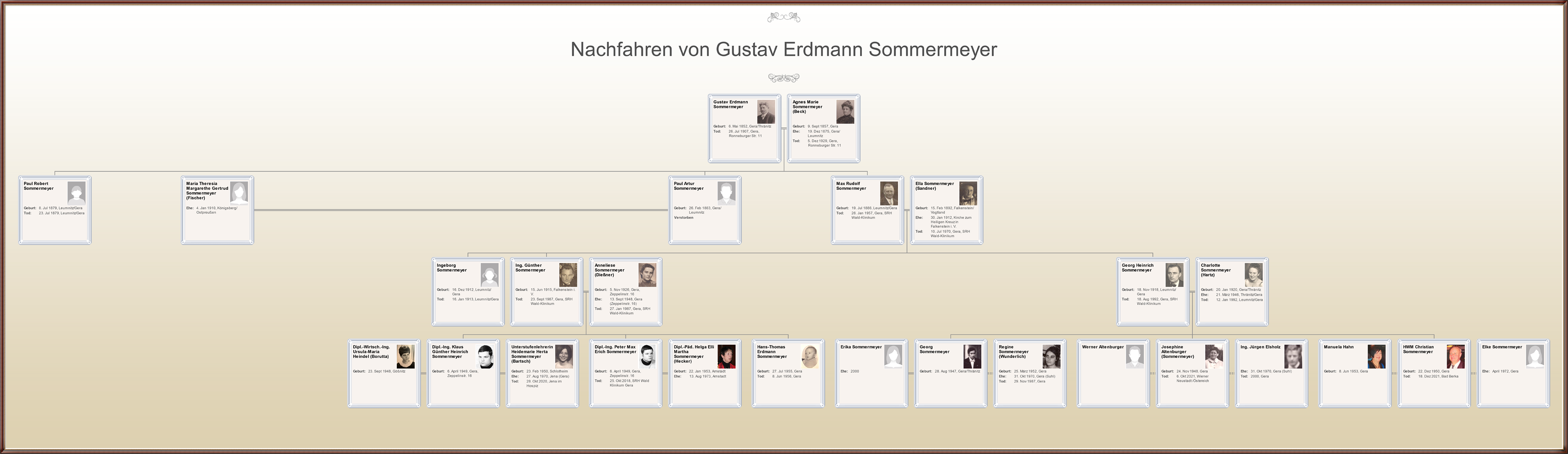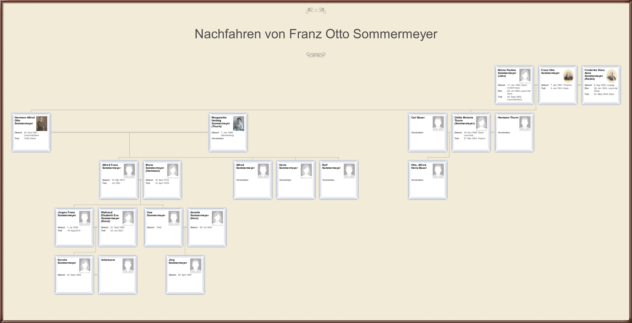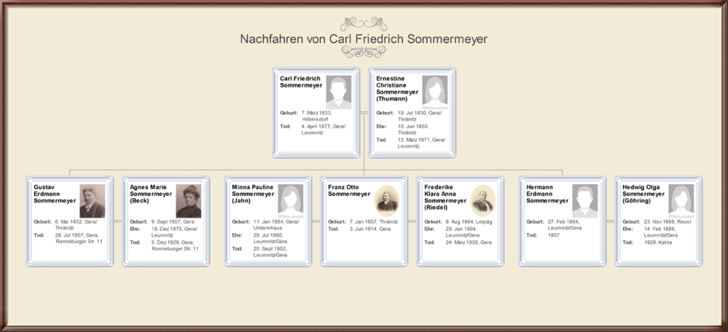 Hier die zwei Stammbäume von Gustav Erdmann und Agnes Marie, geb. Beck, die Geraer Linie und der von Franz Otto mit seinen beiden Frauen Minna Pauline, geb. Jahn und Frederike Klara Anna, geb. Riedel, die Kahlaer Linie.
