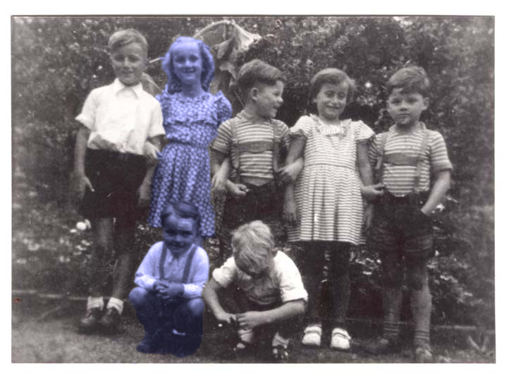 1954 im August zu Georgs Geburtstag in Leumnitz von links: Georg, Klaus, Josephine, Peter, unten Christian (eingefärbt: Eva und Andreas Ubrig)